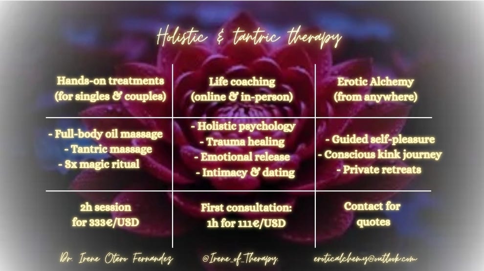 PS: in case you're feeling generous, and/or curious about my personal story, you can also support my work (I'm writing a book about my journey with Erotic Alchemy) by subscribing to my paid Substack, where I'll be publishing a chapter every month. And, as always, your feedback is more than welcome!